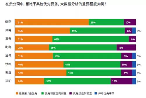 根据埃森哲与通用电气的一项调研显示,在所有受调查的行业中,八到九成的企业都表示,大数据分析是他们当前最重要或是前三大重要的事务之一。尤其是在航空业,61%的受访企业表示,大数据分析在该企业具有最高的优先程度。同时,73%的企业在大数据分析方面的投资已超过企业技术总预算的20%,而两成以上的企业投资比例超过了30%。
