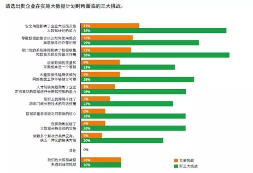 当被问及实施大数据分析战略的三大挑战时,受访者提及频率最高的是“部门间的系统障碍影响了数据收集和数据关联发挥最大作用”(36%)。此外,对于29%的高管而言,前三大挑战之一便是零散数据的合并以及能否使用整合后的数据仓库。